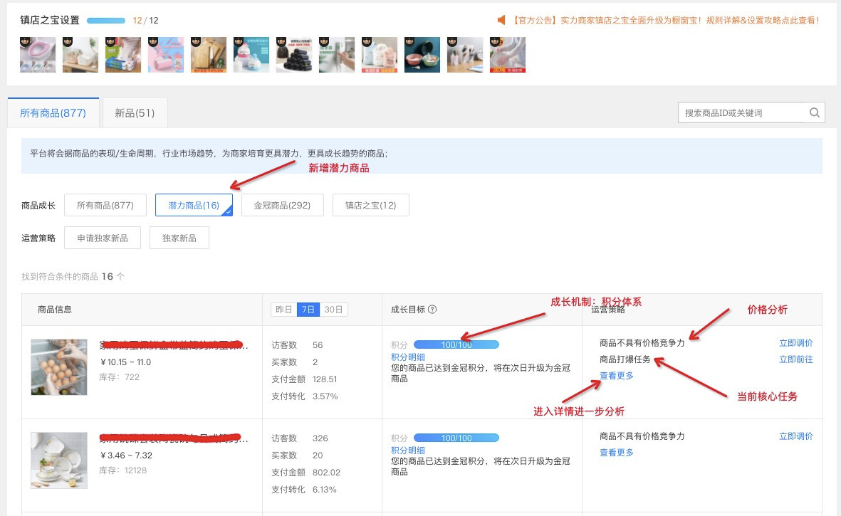 潛力商品主要是有新品標的產品,配飾特色貨盤,掘金商品,以及走勢好的趨勢 品。潛力商品完成成長任務后,進入金冠。