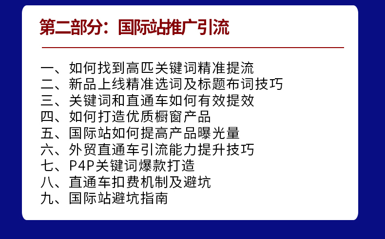 【多米咨詢】阿里國際站課程介紹 2021-01-18 15:17:23 來源:多米咨詢 【多米咨詢】國際站課程重磅來襲!很多企業反映國際站運營難,投了10萬沒有一點水花,推廣費用逐年加倍,花費不見效果參加太多學習,都沒有辦法落地,平臺套路太深,如何規避風險2021年多米咨詢隆重推出《阿里國際站課程》系統讓企業學會如何做好國際站,如何發現問題,找到解決方法,快速提升業績。現在開啟國際站預報名,每屆只招收20家企業,需要參加的可以聯系學習顧問名額有限,先到先得! 相關文章推薦 阿里國際站櫥窗優勢及日常管理要點阿里國際站運營8大選品方向阿里國際站金品誠企有必要開通嗎?什么產品適合入駐阿里國際站?阿里國際站產品發布數量多少合適?2021年企業該如何做阿里巴巴國際站?阿里國際站新手運營日常工作內容